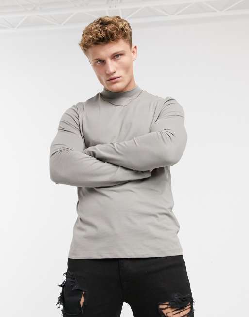 New Look – Langärmliges Baumwoll-Shirt in Grau mit Stehkragen - GREY