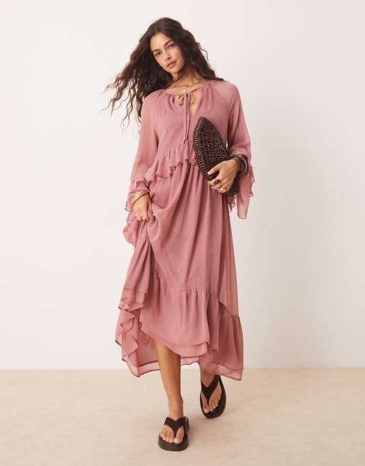 New Look – Langärmliges Maxikleid aus Chiffon in Rosa mit Rüschen