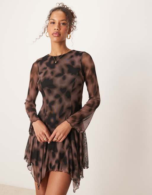 New Look – Langärmliges Netzstoff-Minikleid in Braun mit Blumenmuster