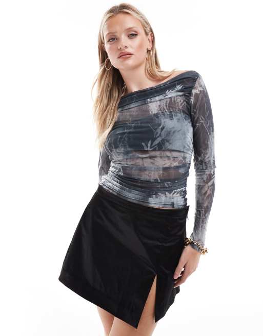 New Look – Langärmliges Netzstoff-Oberteil in Grau mit Muster und Schlitzausschnitt