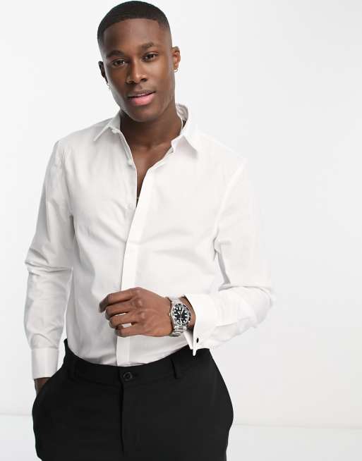 New Look – Langärmliges Popeline-Hemd in Weiß mit Manschettenknöpfen