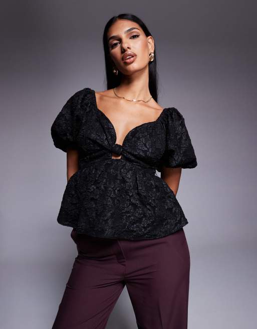 New Look – Oberteil in Schwarz mit Jacquard-Muster und Puffärmeln