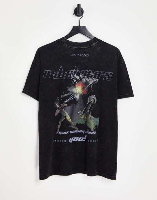 Night Addict – T-Shirt in schwarzer Acid-Waschung mit „Robot Wars“-Grafikprint auf dem Rücken