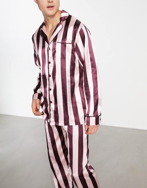 Night – Gestreifter Satin-Pyjama in Burgunderrot und Rosa