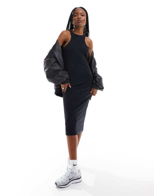 Nike – Geripptes, mittellanges Neckholder-Kleid in Schwarz