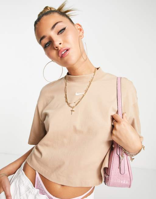 Nike – Kurzes, kastiges T-Shirt in Hanfbraun mit kleinem Swoosh-Logo und hohem Kragen