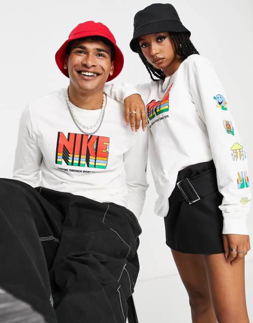 Nike – Unisex – Weißes Langarm-Shirt mit Brustgrafik in kräftigen Farben