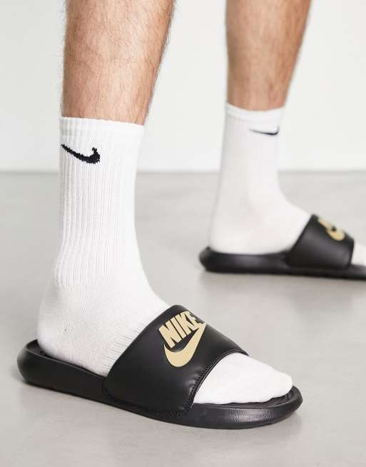 Nike – Victori One – Slider in Schwarz mit rosegoldenem Logo