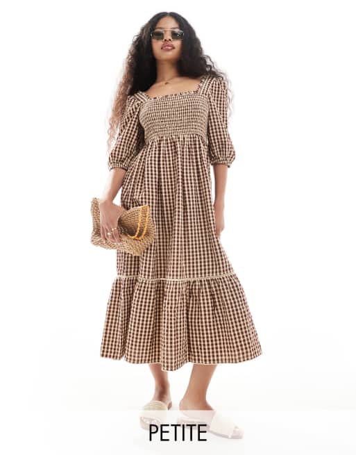 Nobody's Child Petite – Elsa – Wadenlanges Kleid in Braun mit Vichy-Karo und Ballonärmeln