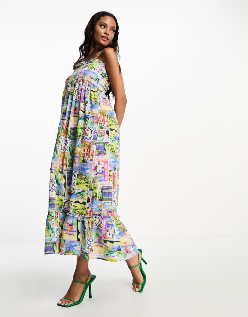 Nobody's Child – Camisolekleid mit Postkartenprint und Bindeband an den Schultern