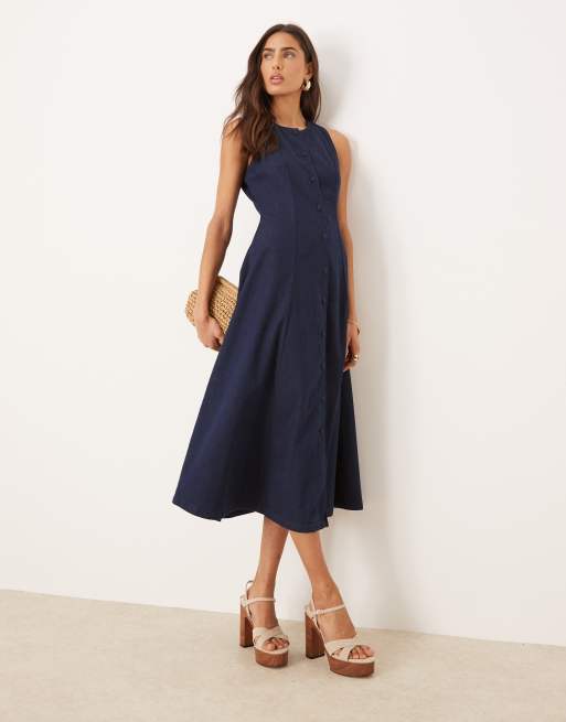 Nobody's Child – Shari – Ärmelloses Midikleid aus Denim in Indigoblau mit A-Linien-Schnitt und Knopfleiste
