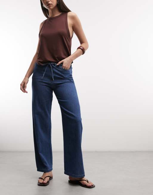 Noisy May – Jeanshose in Mittelblau mit weitem Bein und Bindegürtel