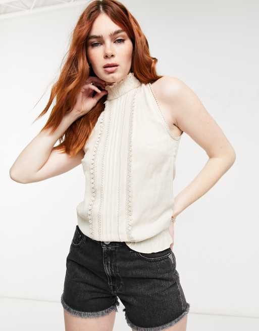 Oasis – Oberteil mit gerafftem Ausschnitt und Spitzenbesatz in Neutral