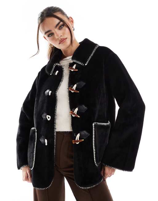 Object – Kunstpelz-Jacke in Schwarz mit Knebelverschluss
