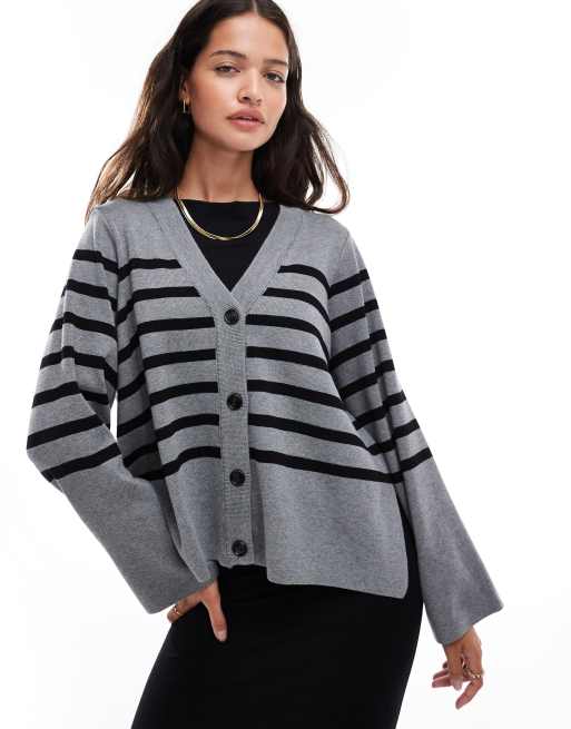 Object – Strickjacke in Grau mit schwarzen Streifen und durchgehender Knopfleiste