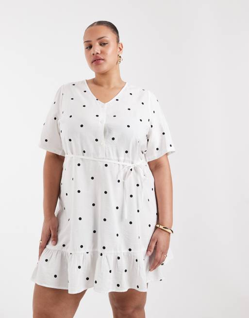 ONLY Curve – Minikleid in Weiß mit Bindegürtel und Polka Dots