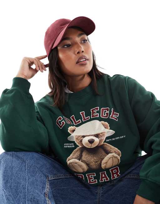 ONLY Curve – Oversize-Sweatshirt in Dunkelgrün mit Teddybär-Aufdruck