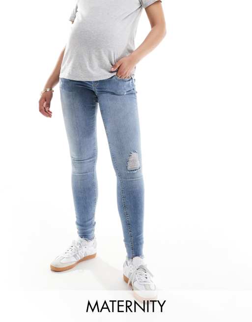 ONLY Maternity – Blush – Skinny-Jeans in Mittelblau mit ausgefranstem Saum