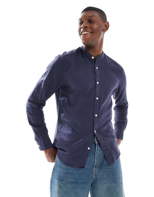 ONLY & SONS – Leinenmix-Hemd in Marineblau mit Grandad-Kragen