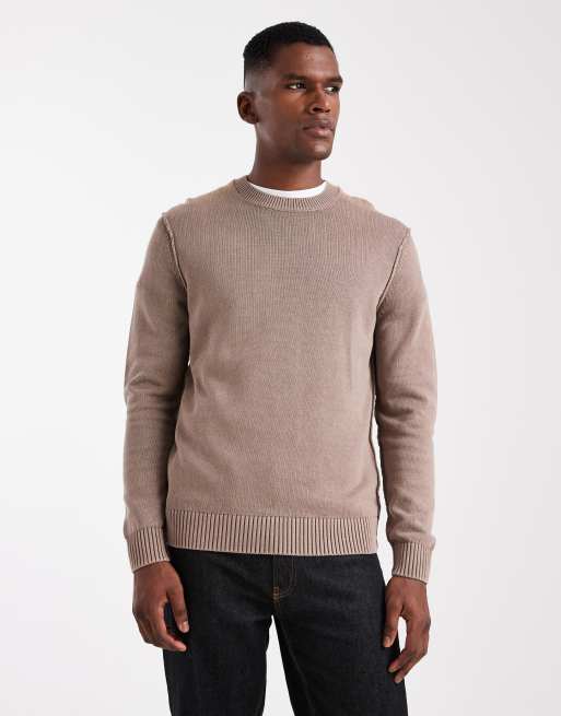 ONLY & SONS – Regular-Fit-Strickpullover in Hellbraun mit Rundhalsausschnitt und sichtbaren Nähten