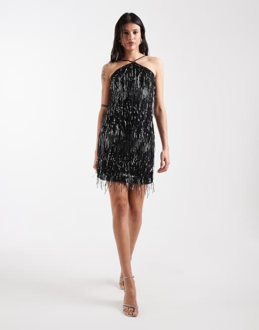 ONLY Tall – Neckholder-Minikleid in Schwarz mit Paillettenfransen