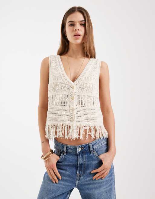 ONLY – Gehäkelte Strickweste in Cremeweiß mit Fransen