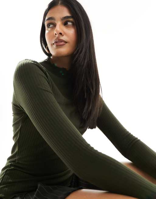 Only – Geripptes, hochgeschlossenes Oberteil in Dunkelgrün mit Kräuselsaum