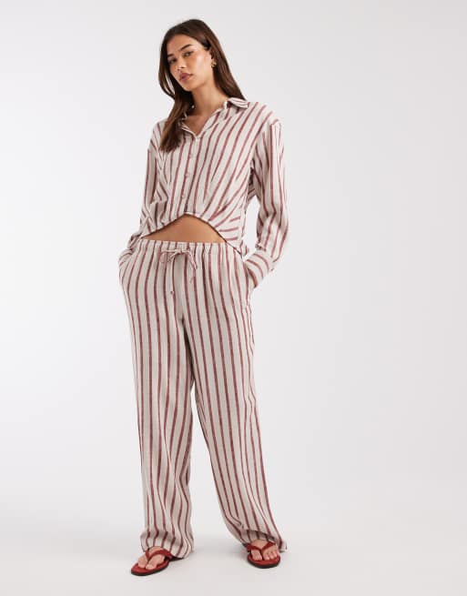 ONLY – Gestreifte Hose mit Leinen in Beige und Rot mit Bindegürtel, Kombiteil