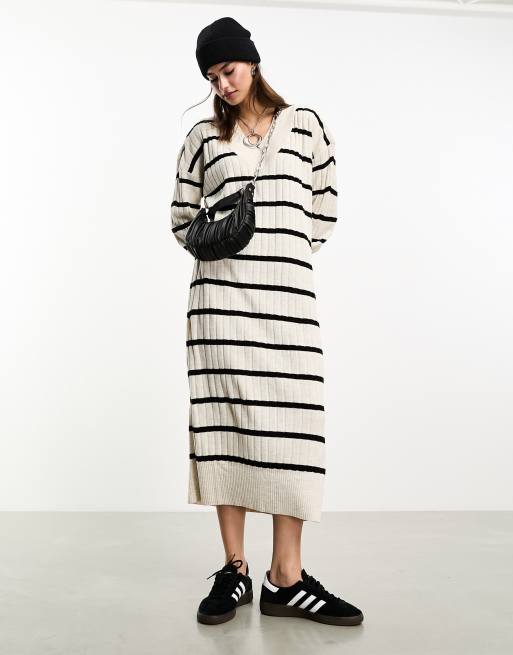 Only – Gestreiftes, wadenlanges Strickkleid in Cremeweiß und Schwarz mit V-Ausschnitt