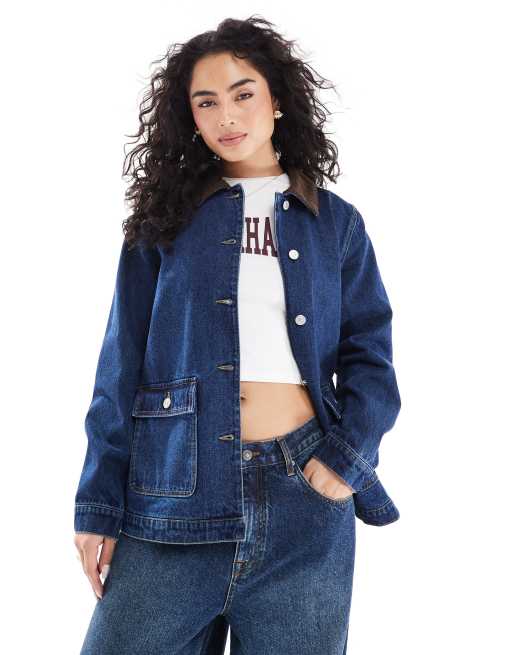 ONLY – Jeansjacke in Dunkelblau mit Cord-Detail