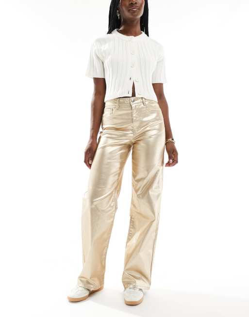 ONLY – Jucy – Weit geschnittene Jeans in Metallic-Gold mit hohem Bund