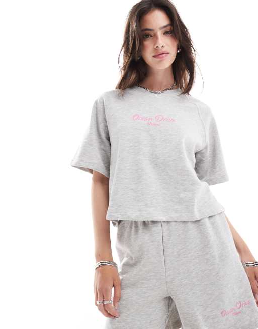 ONLY – Kurzärmliges Boxy Fit Sweat-Oberteil in Hellgrau mit Miami-Print, Kombiteil