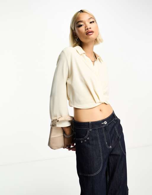 Only – Kurze Bluse in Beige mit V-Ausschnitt und verdrehter Vorderseite