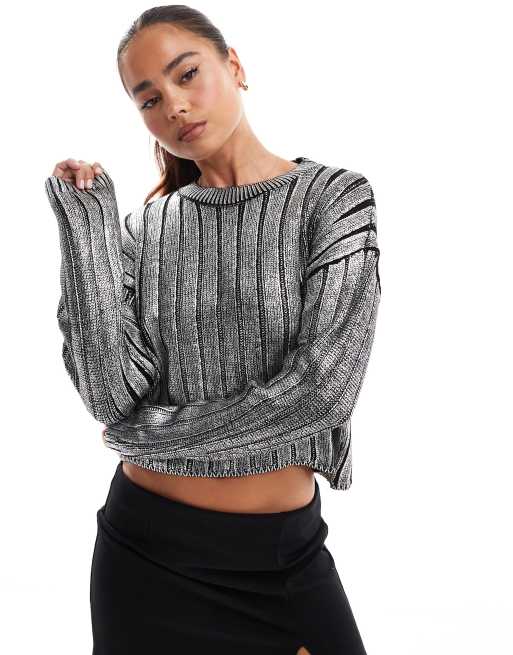 ONLY – Kurzer Strickpullover in Metallic-Silber mit Zopfmuster