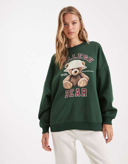 ONLY – Oversize-Sweatshirt in Dunkelgrün mit Teddybär-Aufdruck