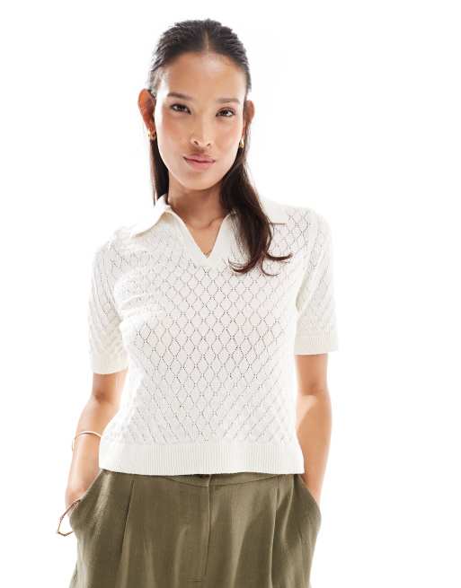 ONLY – Polohemd aus weitmaschigem Strick in Beige
