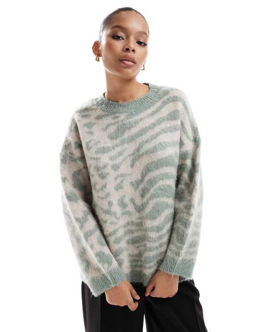 ONLY – Pullover in Hellgrün und Weiß mit Leopardenmuster und Rundhalsausschnitt