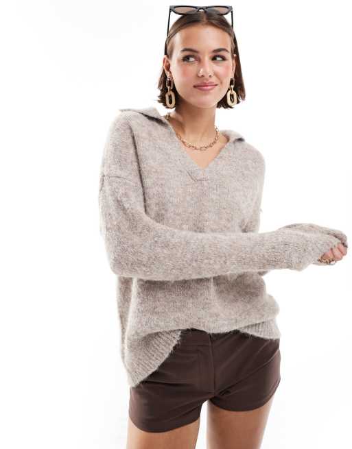 ONLY – Pullover in meliertem Beige mit geteiltem Ausschnitt