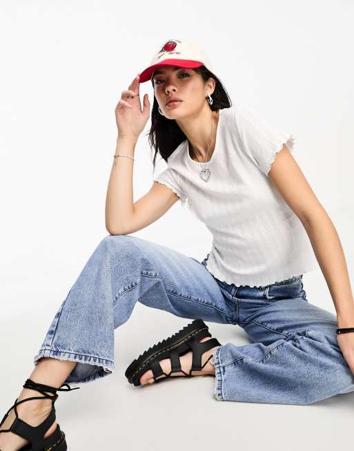 Only – T-Shirt aus Pointelle in Weiß mit Kräuselsaum