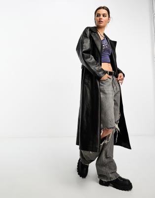 Only – Trenchcoat aus schwarzem Kunstleder mit Bindegürtel