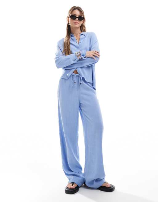 ONLY – Weit geschnittene Schlupfhose aus Leinenmix in Hellblau mit Perlendetail, Kombiteil