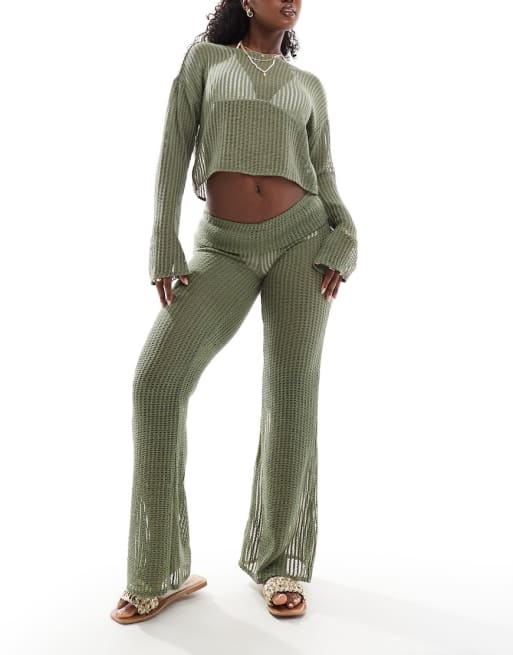 ONLY – Weitmaschiges Strick-Set in Salbeigrün aus Oberteil und Hose mit Kräuselsaum