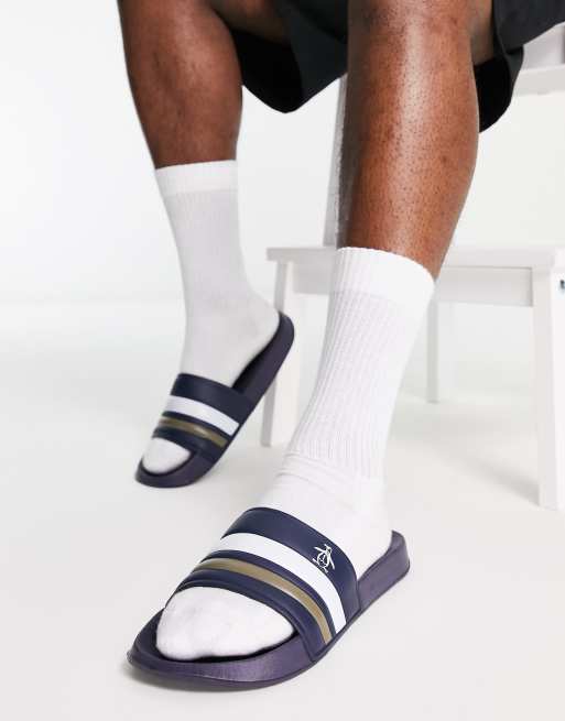 Original Penguin – Slider mit Logo in Marineblau mit Retro-Streifen