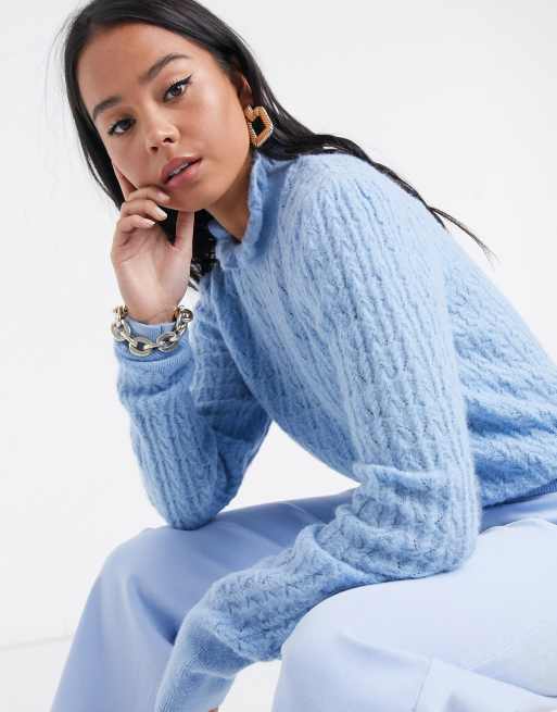 & Other Stories – Blauer, flauschiger Pointelle-Pullover mit Rüschenausschnitt