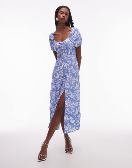 & Other Stories – Midikleid in Blau geblümt mit Puffärmeln