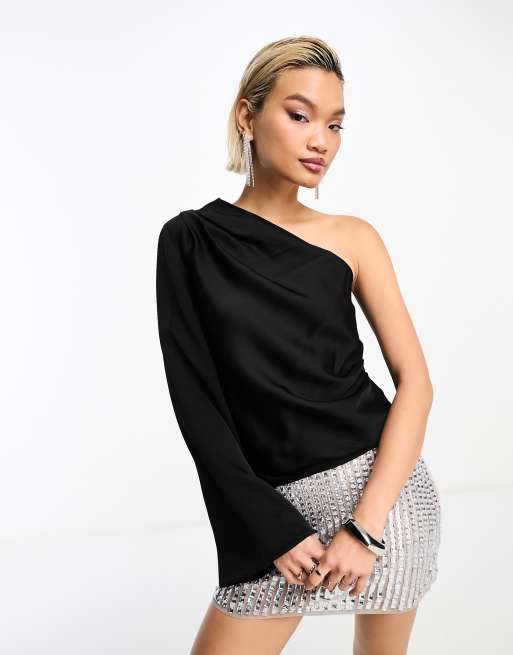 & Other Stories – Oberteil in Schwarz mit ausgestelltem One-Shoulder-Ärmel und drapiertem, gebundenen Ausschnitt