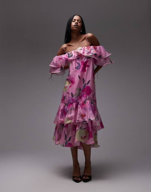 & Other Stories – Schulterfreies Midaxi-Kleid mit Rüschen und rosa Blumenmuster