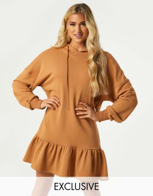 Outrageous Fortune – Exclusive – Sweatkleid mit Rüschensaum und Kapuze in Camel