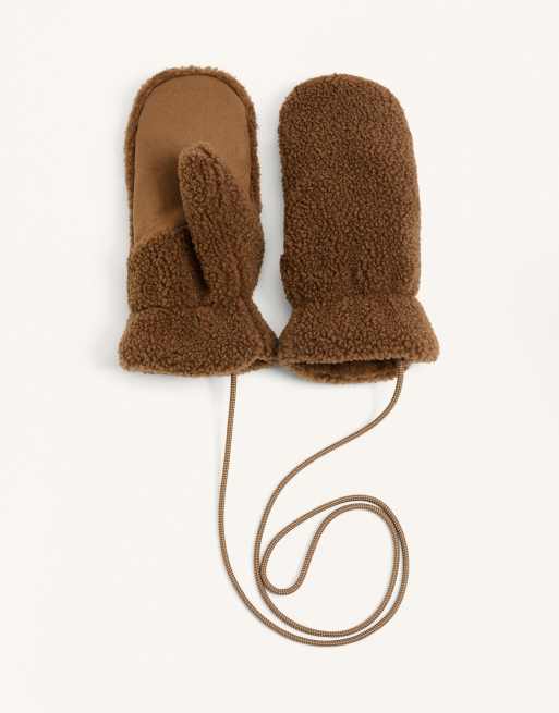 OYSHO – Fäustlinge aus Lammfellimitat mit Kordel in Maulwurfsgrau