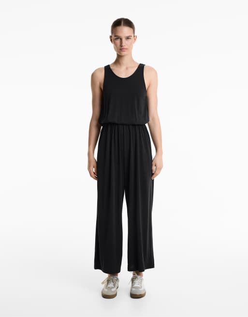Oysho – Fließender Midi-Jumpsuit aus Modal in Schwarz mit überkreuztem Design am Rücken